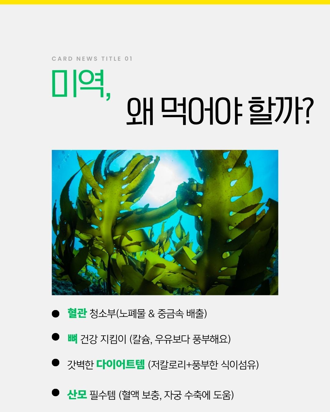 4. The Best Gift for Postpartum Mothers It's a well-known fact in Korea that miyeok is the go-to food for new mothers. The rich iodine content in miyeok helps replenish blood lost during childbirth and aids in uterine contraction. Furthermore, its ample calcium and iron are a great help in the mother's recovery and in providing nutrients for breastfeeding.